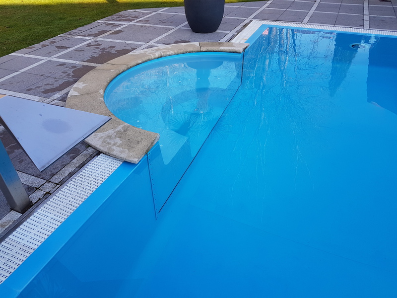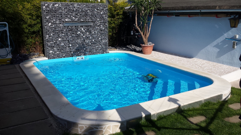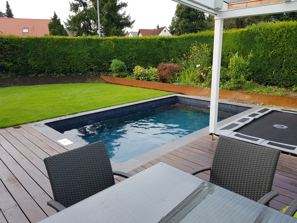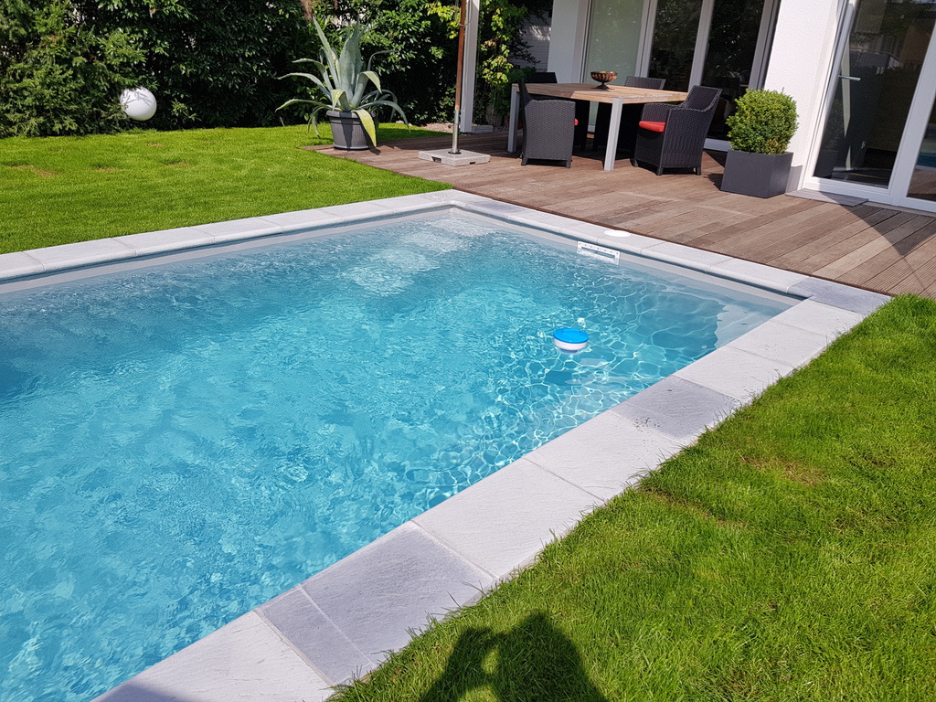 Skimmer-Schwimmbecken mit gewebeverstärkter Touchfolie ausgekleidet, farbige LED Scheinwerfer, Gegenstromanlage, Chlorwasseraufbereitung.