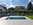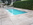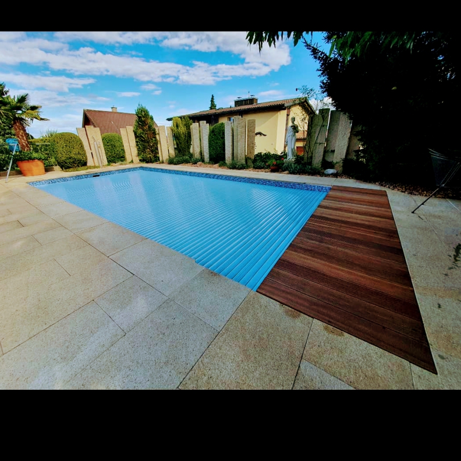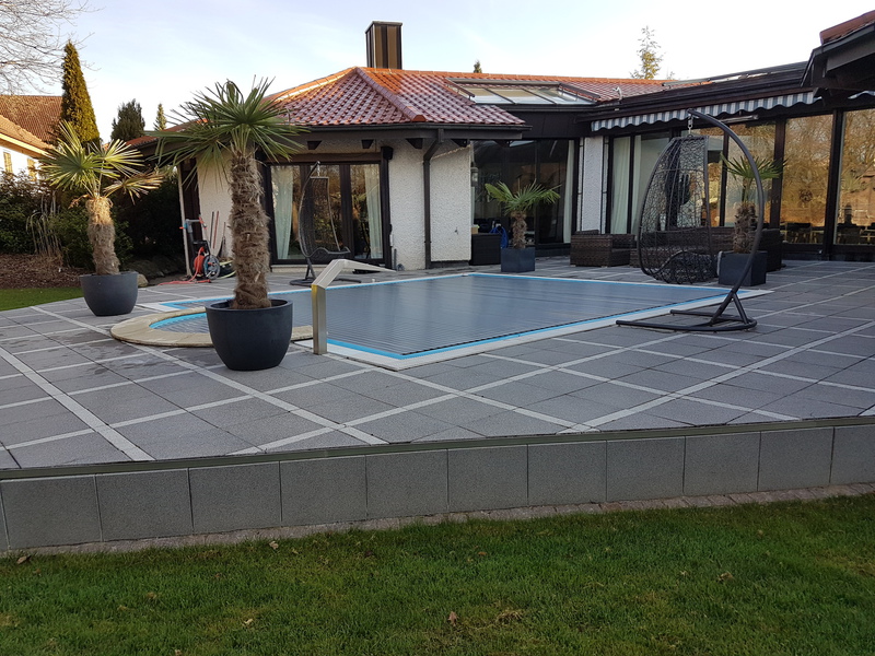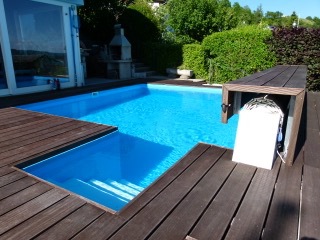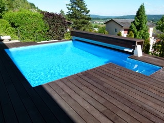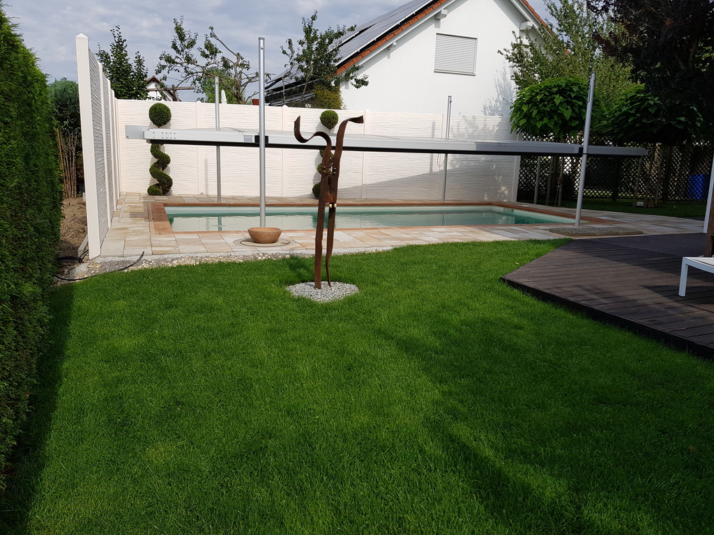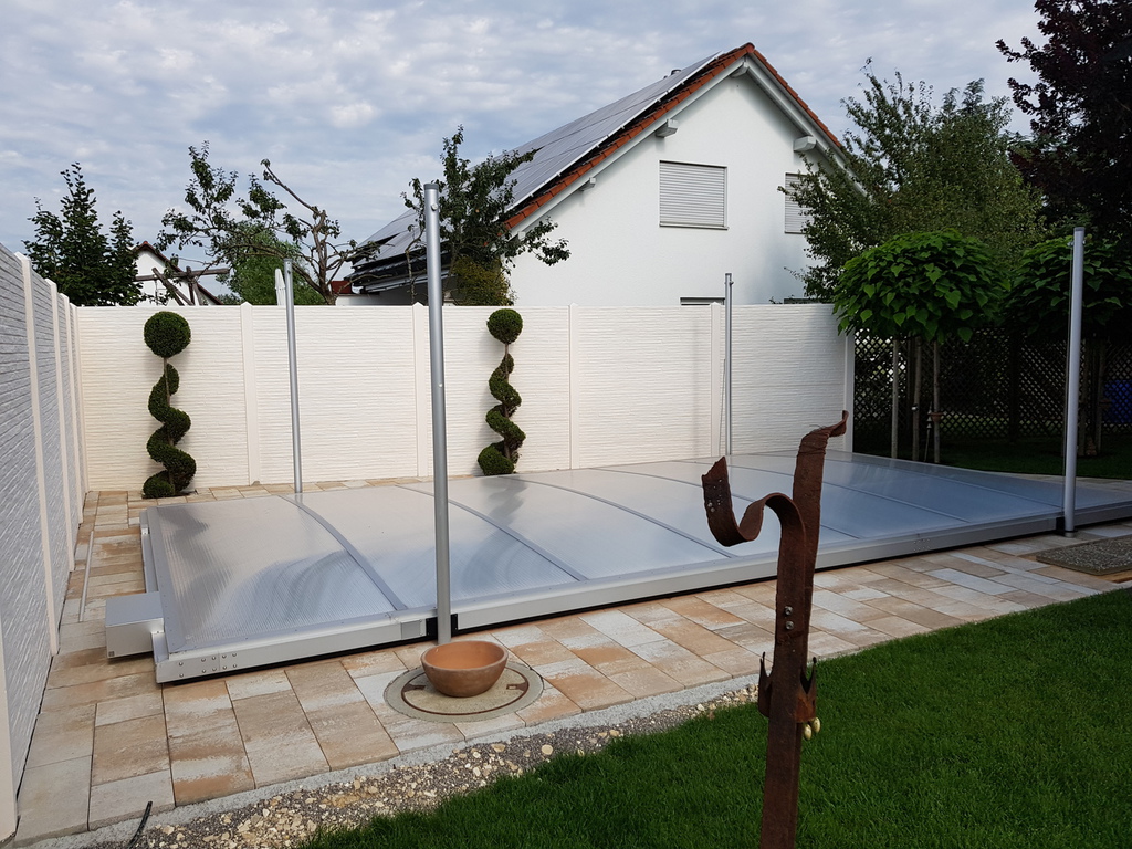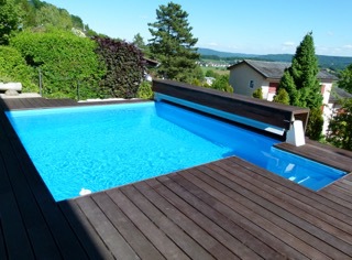 Skimmer-Schwimmbecken mit gewebeverstärkter Folie ausgekleidet, römischer Treppe, farbige Unterwasserscheinwerfer, Gegenstromanlage und elektrischer Überdachung.