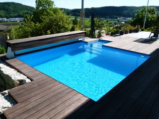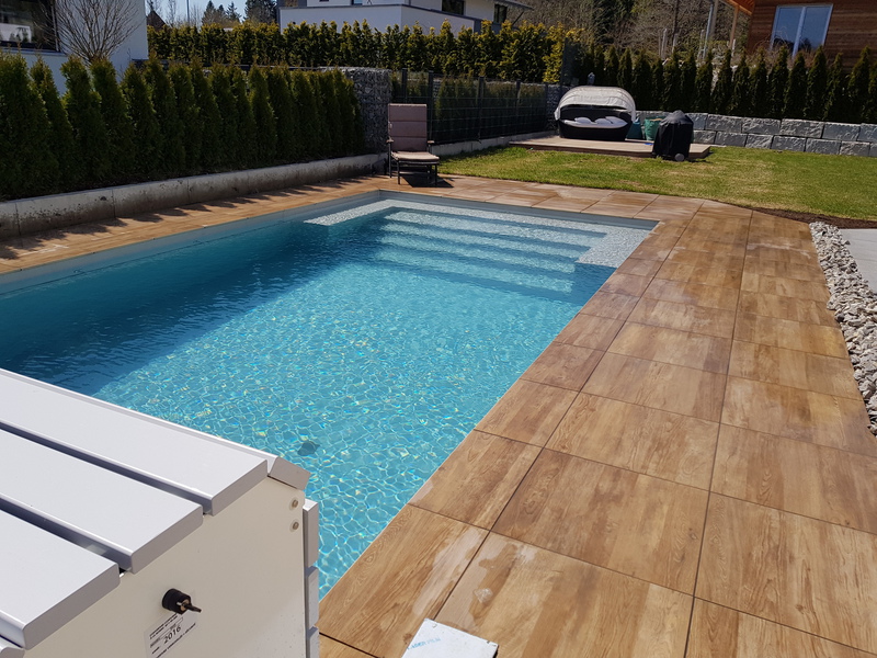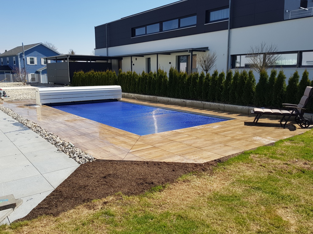 Skimmer-Schwimmbecken mit gewebeverstärkter Folie ausgekleidet, integrierter Treppe, farbige Unterwasserscheinwerfer, Gegenstromanlage und automatischer Oberflur,-Lamellenabdeckung.