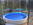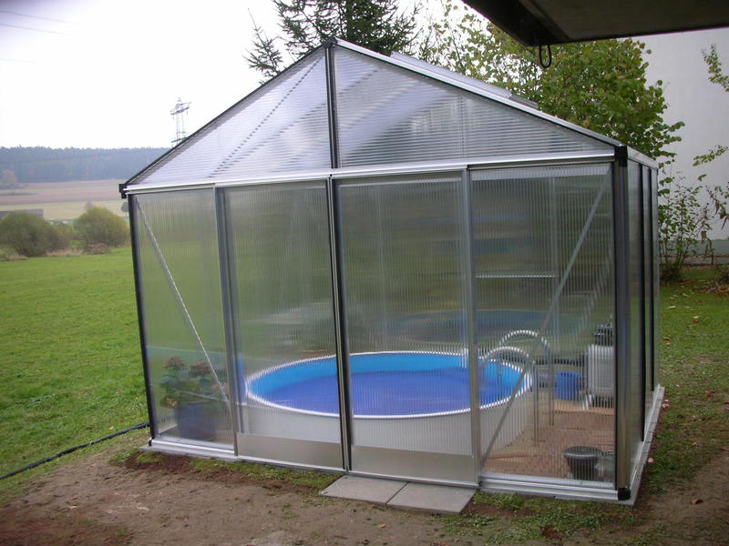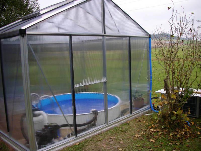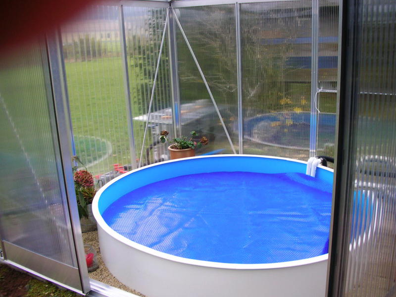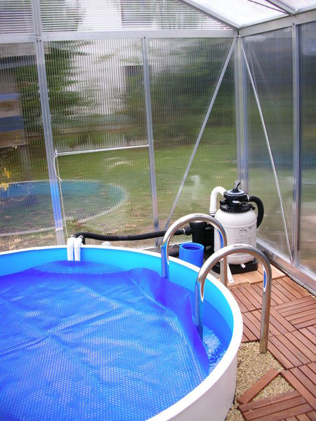 Skimmer-Stahlwandbecken mit gewebeverstärkter Folie ausgekleidet, Einhängeleiter, Luftpolsterfolie, Überdachung und Salzelektrolyse.