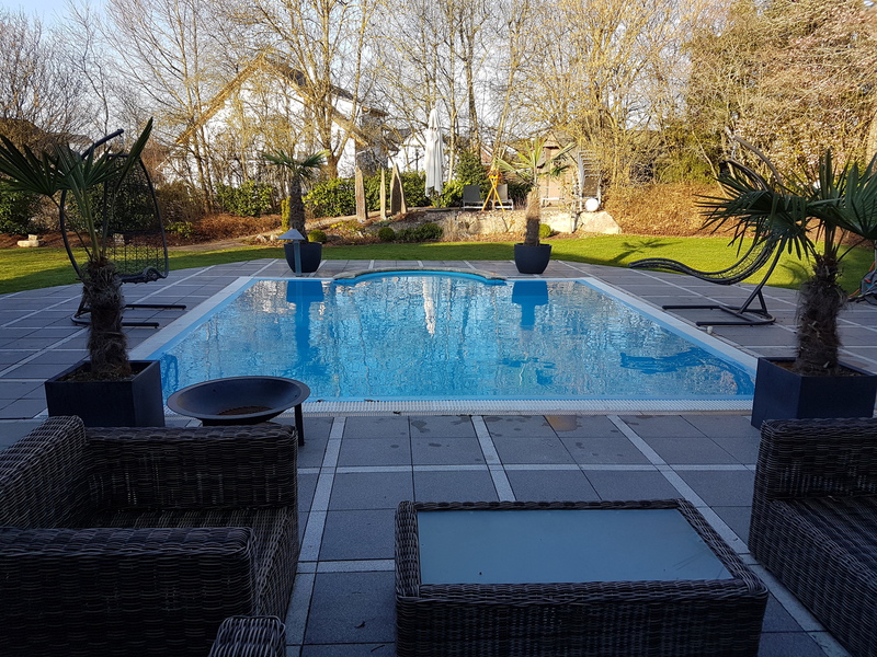 Überlauf-Schwimmbecken mit gewebeverstärkter Folie ausgekleidet, integrierter Treppe, zwei unterschiedlichen Beckentiefen, farbige LED Scheinwerfer, Gegenstromanlage, Chlorwasseraufbereitung und automatischer Unterflur,-Solarlamellenabdeckung. Exklusiv mit integrierter Panzerscheibe mit Sicht vom Kellerbüro in den Pool.