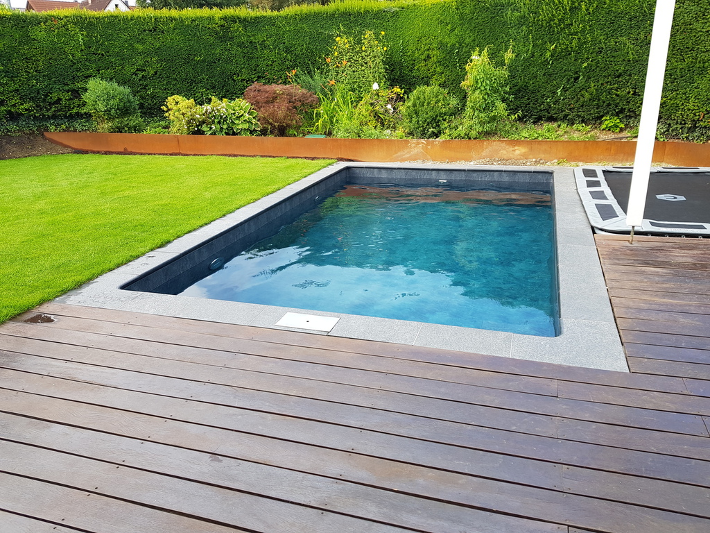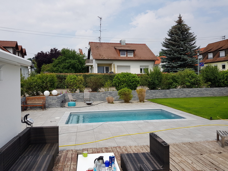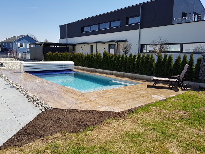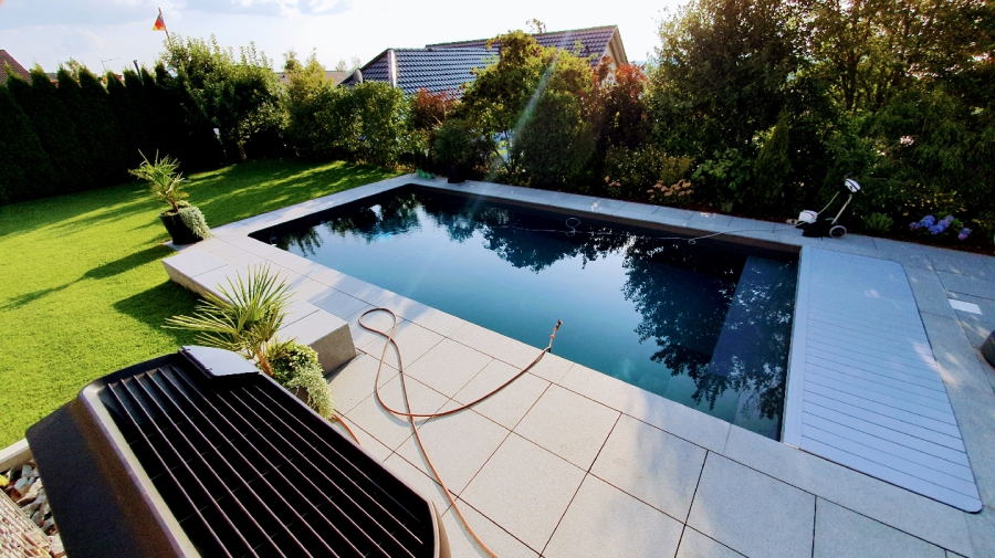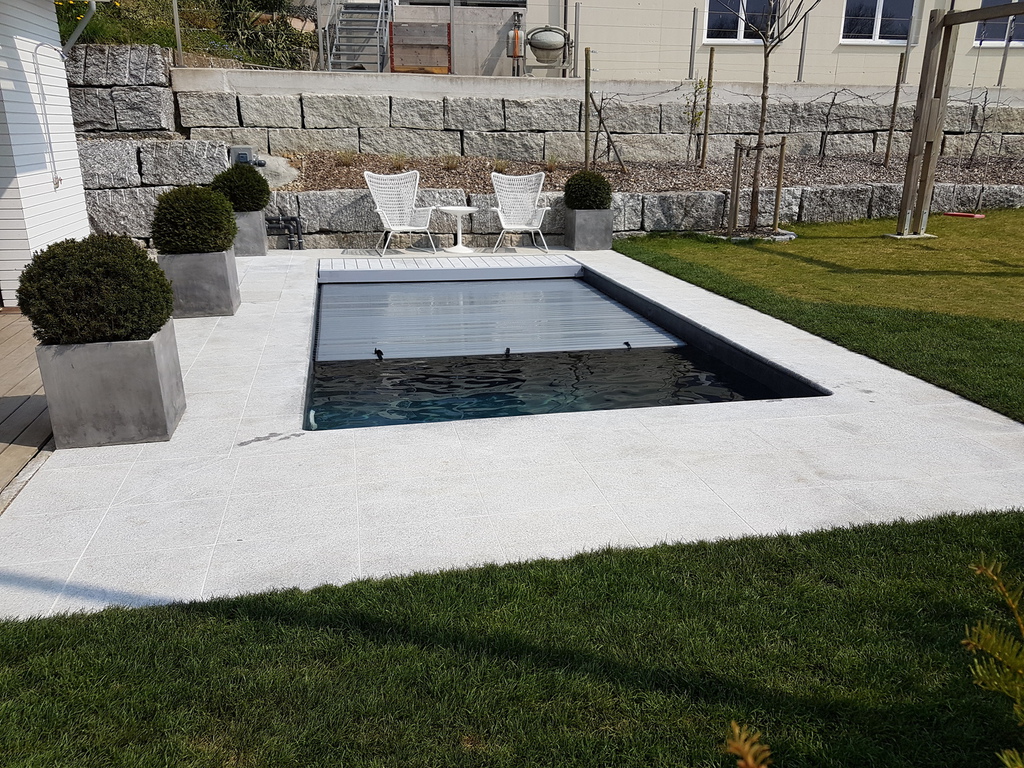 Skimmer-Schwimmbecken mit gewebeverstärkter Touchfolie ausgekleidet, integrierter Treppe, farbige LED Scheinwerfer, Gegenstromanlage, Salzwasseraufbereitung und automatischer Unterflur,-Solarlamellenabdeckung. Alles abgerundet mit Edlen Granitsteinen.