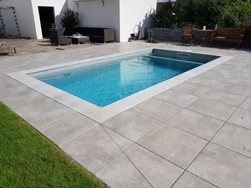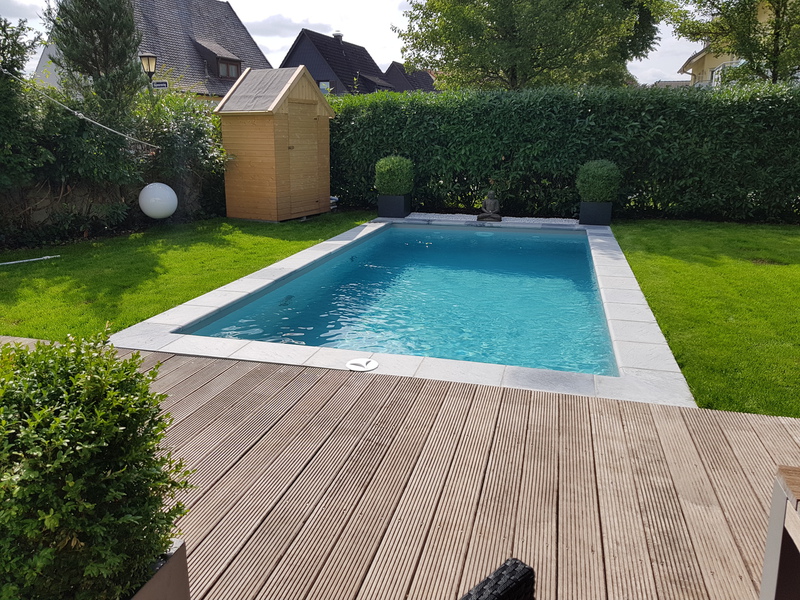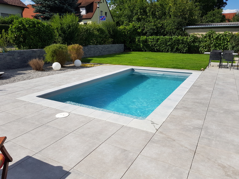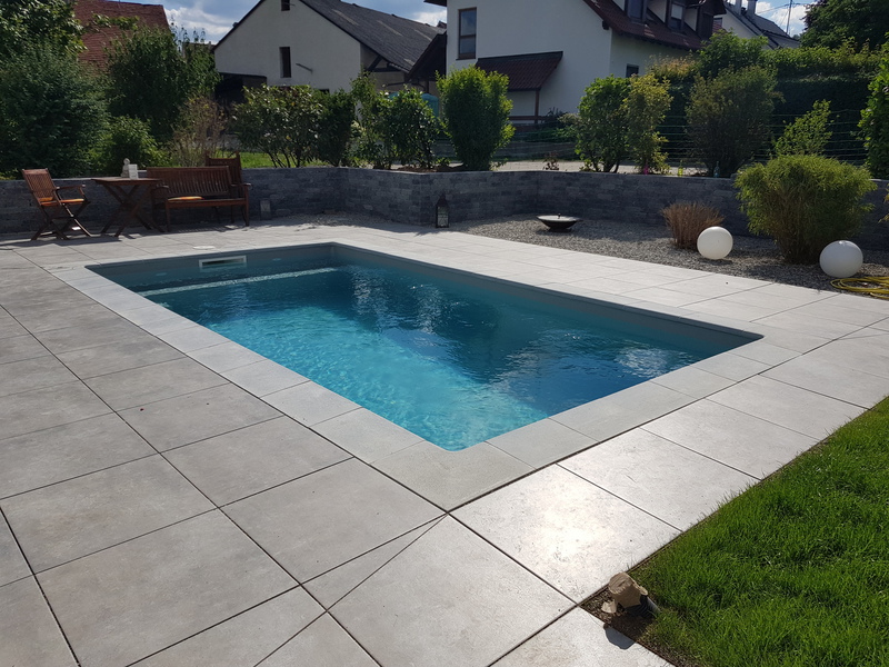Skimmer-Schwimmbecken aus PP, integrierter Treppe, farbige LED Scheinwerfer, Gegenstromanlage und Salzwasseraufbereitung.