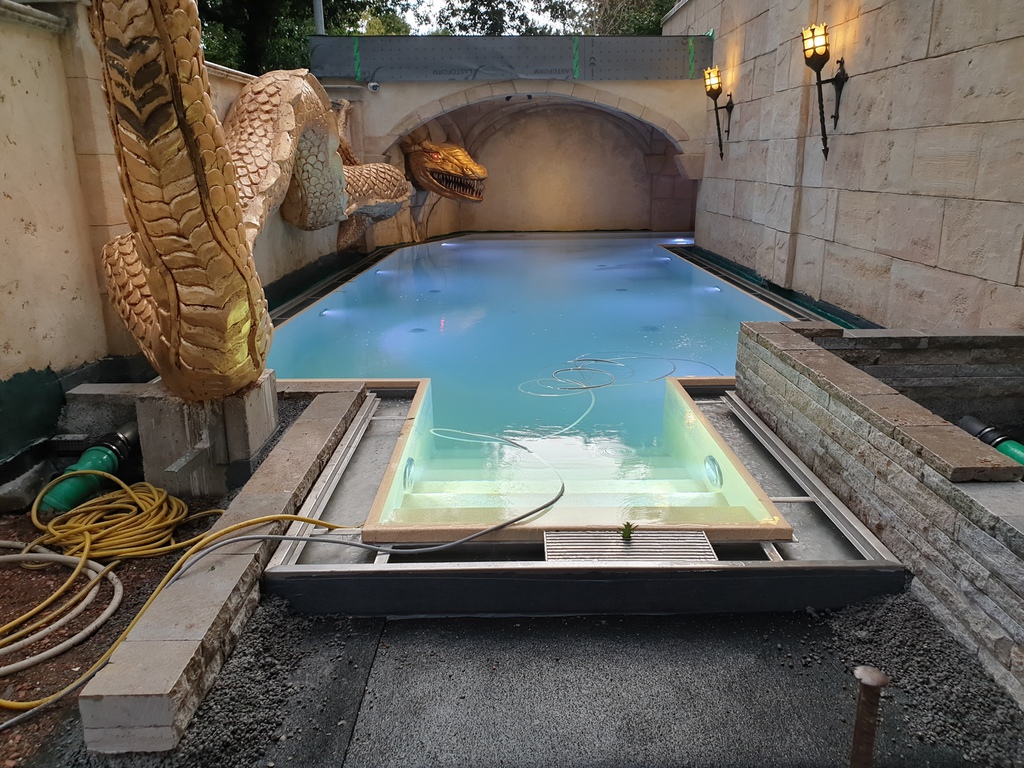 Skimmer-Schwimmbecken mit gewebeverstärkter Folie ausgekleidet, integrierter Treppe, farbige Unterwasserscheinwerfer und automatischer Oberflur,-Lamellenabdeckung.